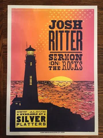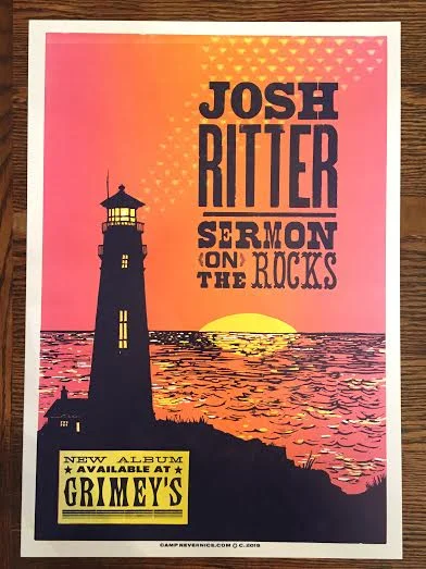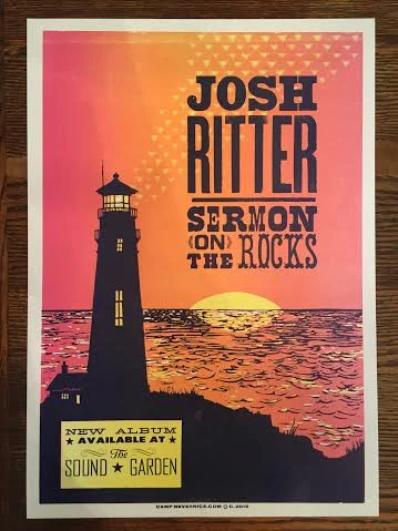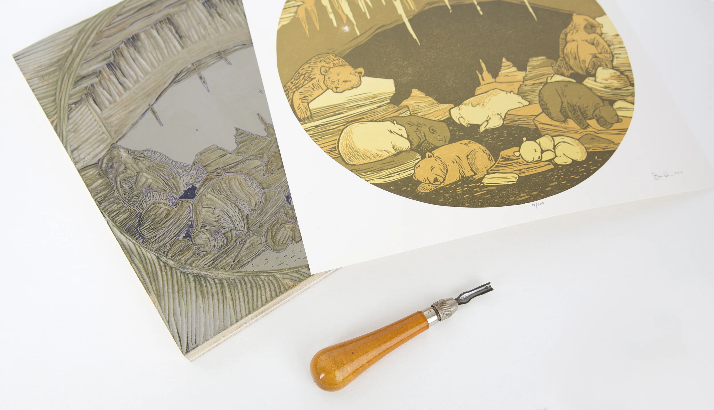 Most of the images created by Camp Nevernice are carved from linoleum. Linoleum is a dense material that is harder than rubber, but softer than wood. This particular relief-printing process is called Linocut. With relief printing, only the raised areas get ink and produce the image and the recessed areas stay “white.” To create this topography, you use gauge tools. I prefer Speedball or Flexcut palm handled carving tools. Generally, these prints are reductive which means you use one block to create all or some of the layers.