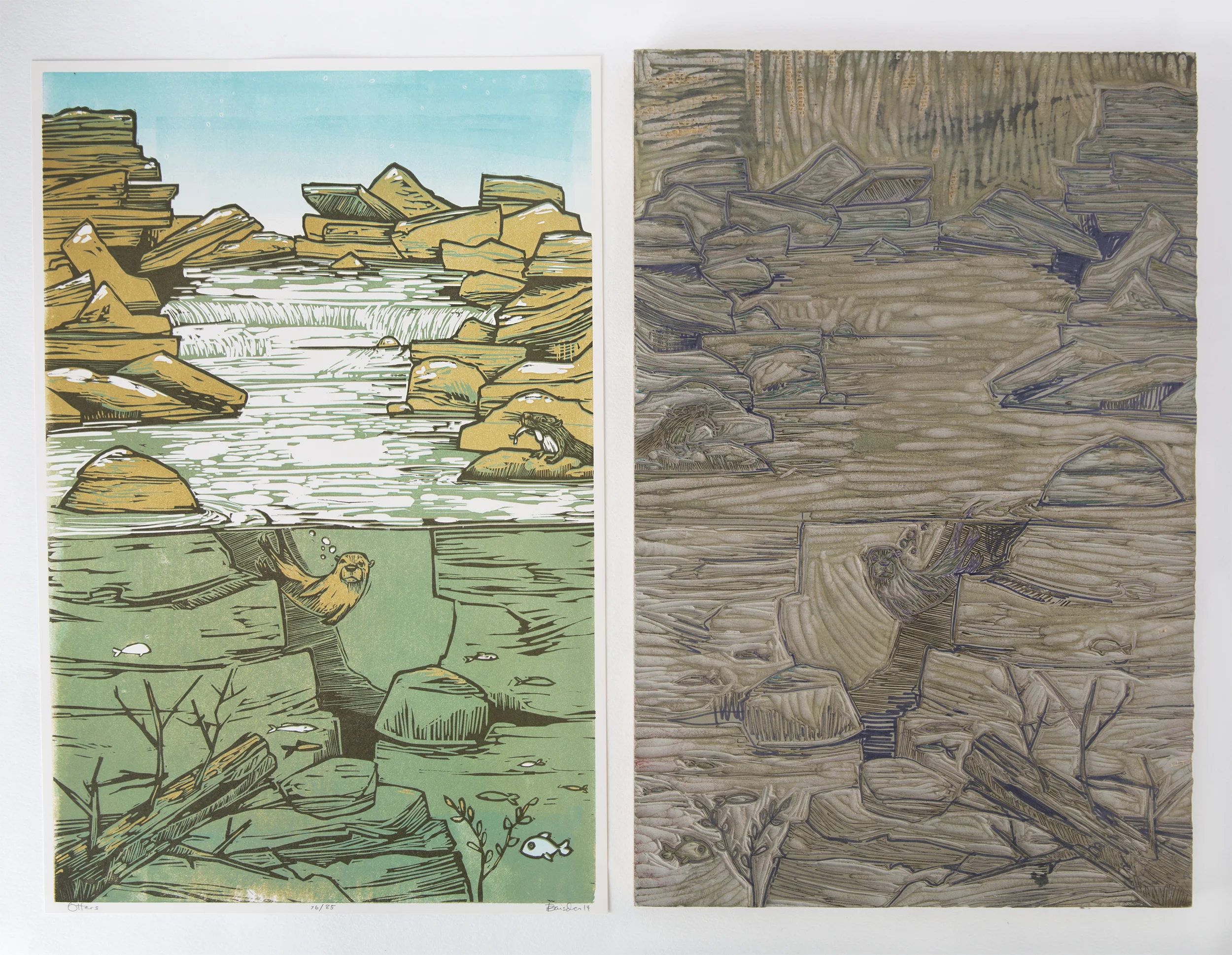 With reduction printing, you start with the whole block for the first color (usually the lightest color and often the full background) and cut it down to the last color (the line work, or “key block”). This means that all the prints are limited to that specific edition. The block is destroyed as the image is created. If you need to print 100 posters, you have to print a little over 100 to make sure you have your intended quantity by the time you’ve finished printing. You print all 100 with the first color. Then carve away from the block what needs to stay that color, and then print the same 100 sheets again with the new carving and new ink (but from the same block). Continue this process until you get to the final line work for the image!